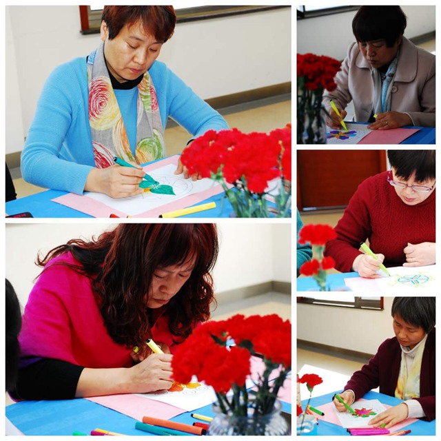 3月8日上午,公司办公楼六楼活动室,轻柔的音乐,美丽的鲜花,五彩的画笔,精美的糕点,还有清爽酸甜的柠檬茶,44位靓丽女工参加了公司女工委精心打造的心理辅导课程--彩绘春天活动。伴随着轻柔舒缓的背景音乐,每个人静心体会,专注地画出内心世界里对春天最真实的感受和色彩。